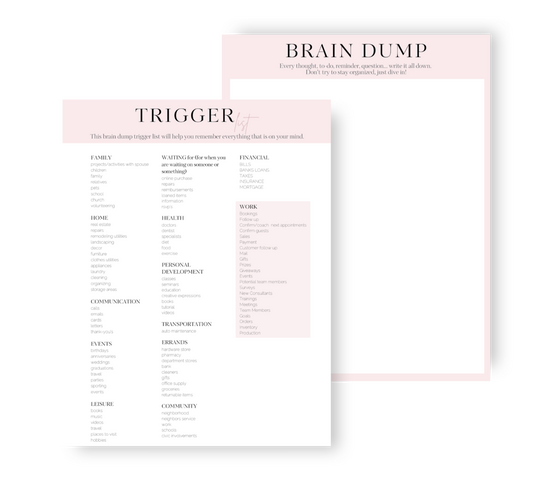 A trigger list is a great tool to use when you are completing a brain dump or mind sweep. It will help to “trigger” memories or tasks that you might not be thinking about. This list might include things about your home, job, errands, or projects that you would otherwise forget.